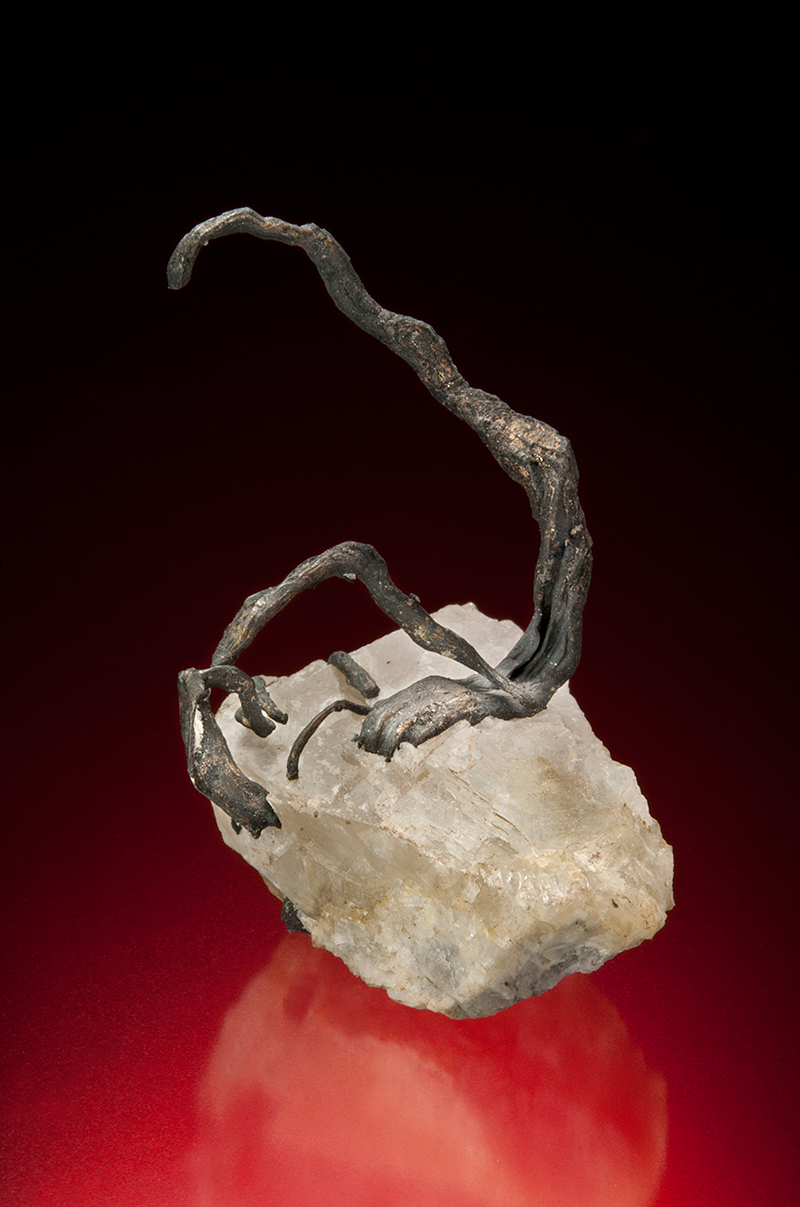 Another stunning piece from Kongsberg, this specimen hosts two prominent silver wires on a partial rhomb of calcite. The largest wire measures 2.8 cm in length. A very nice piece from a classic silver locality. We thought so much of the aesthetics of this piece that we used it on one of our early postcards.
