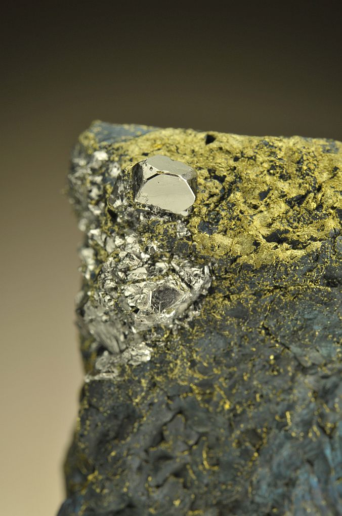 A 3 mm crystal on a 15 mm mass of sperrylite all on massive chalcopyrite. The crystal has been re-attached.