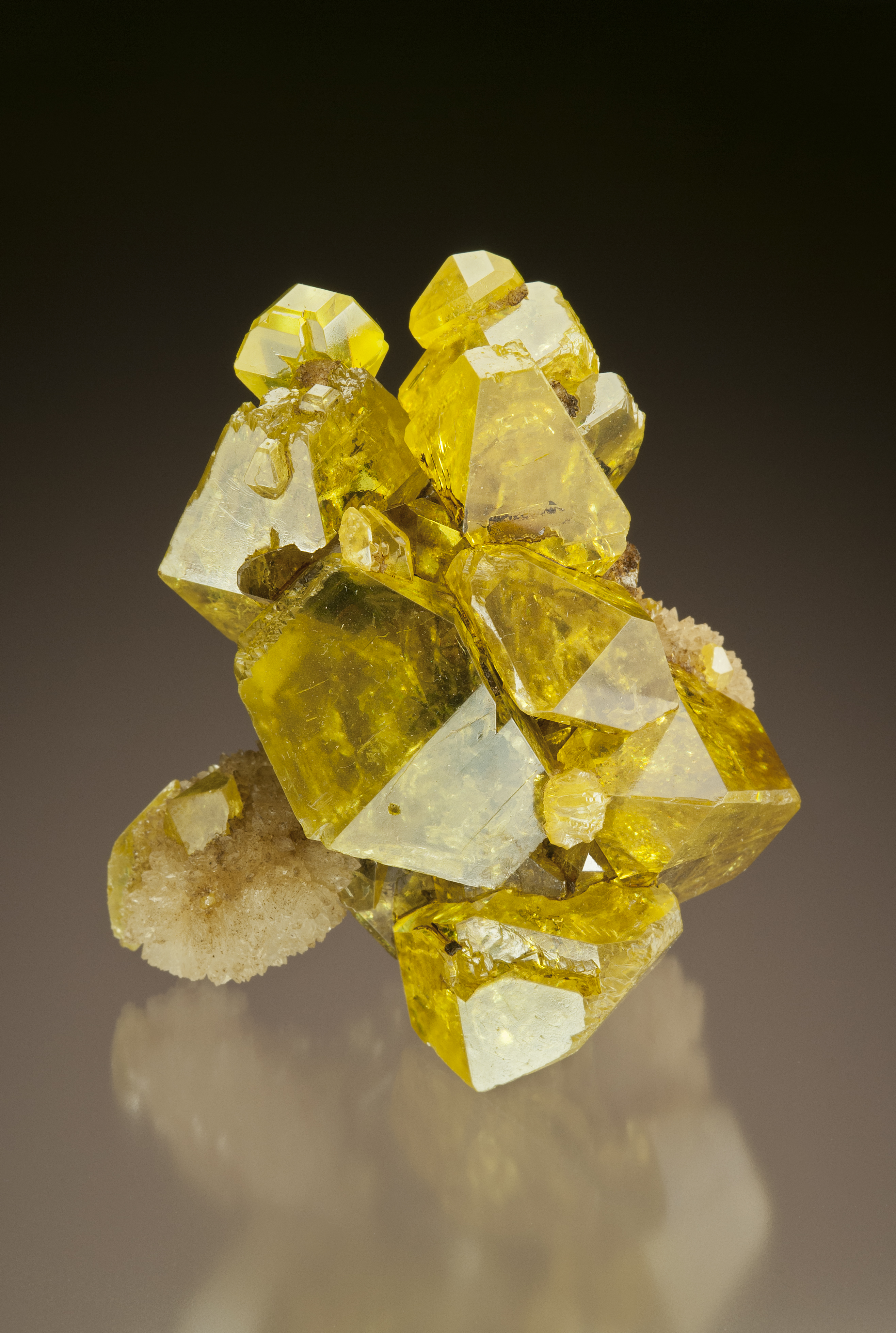 An exceptional cluster of multiple crystals on matrix. Nearly all of the crystals show vibrant internal veils, and a small few approach water clarity. Completely damage free, this piece comes complete with a custom Sunnywood base for an outstanding display.