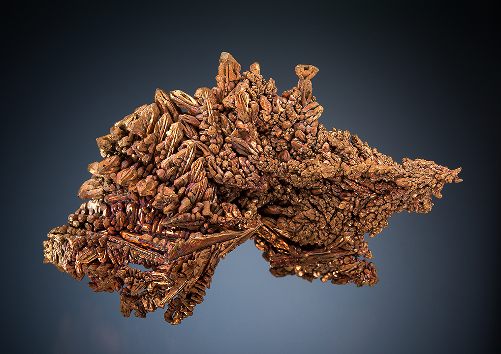 Stan Esbenshade of Midwest Minerals in Tucson has had a contract to collect mineral specimens at the Chino Mine in New Mexico for several years. Most of what he finds is bulk material, but 3 times since he has been collecting there he has found pods of truly world-class copper crystals. The specimens pictured here are from the latest find from late in 2013. All the specimens from the find were removed from encasing rock to expose the copper crystals. Each of the three finds is quite distinctive. In this case the crystals form exquisite interlocking herring-bone growths ranging from quite fine, delicate crystals to occasional very coarse stout crystals, all in quite aesthetic groups of all sizes.