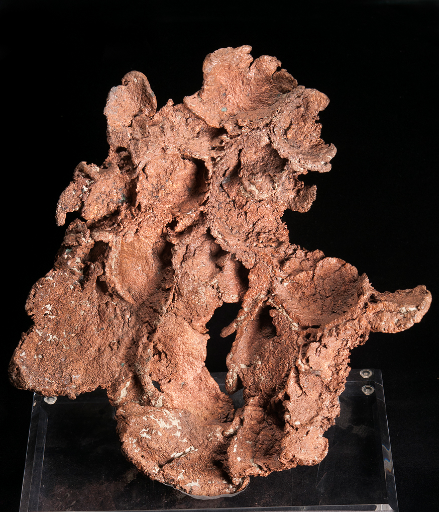 This is a large and impressive display of copper that formed as a cast around a large cobble or group of smaller cobbles in the conglomerate-hosted copper deposits of upper Michigan. The shape of the cobble has been roughly preserved in the overall ovoid shape of the specimen. The remnants of fractures and open spaces can be seen in the fins and ridges of copper that mark the casts of these fractures. A remarkable specimen, complete with a custom Sunnywood base.