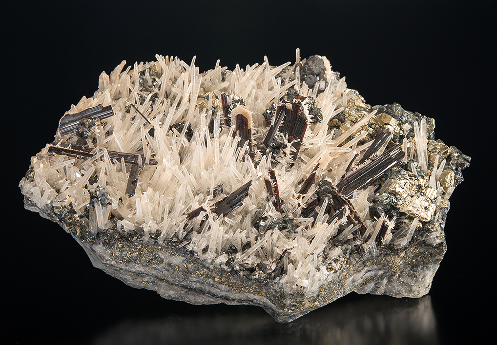 Huebnerite is quite famous from the Sweet Home Mine, but fine specimens are rather elusive. This one is quite good even given the damage to some of the huebnerite crystals. The flat plate is covered in classic Sweet Home needle quartz with lustrous reddish-brown huebnerite blades placed among them. The specimen was purchased by Marv Rausch from Keith Williams with documentation from the John Sinkankas collection. Unfortunately there is no catalog number on the specimen, but the dimensions and description on the Sinkankas card match the specimen. Ultimately the Rausch collection was sold by Gene Schlepp from whom I acquired this specimen.