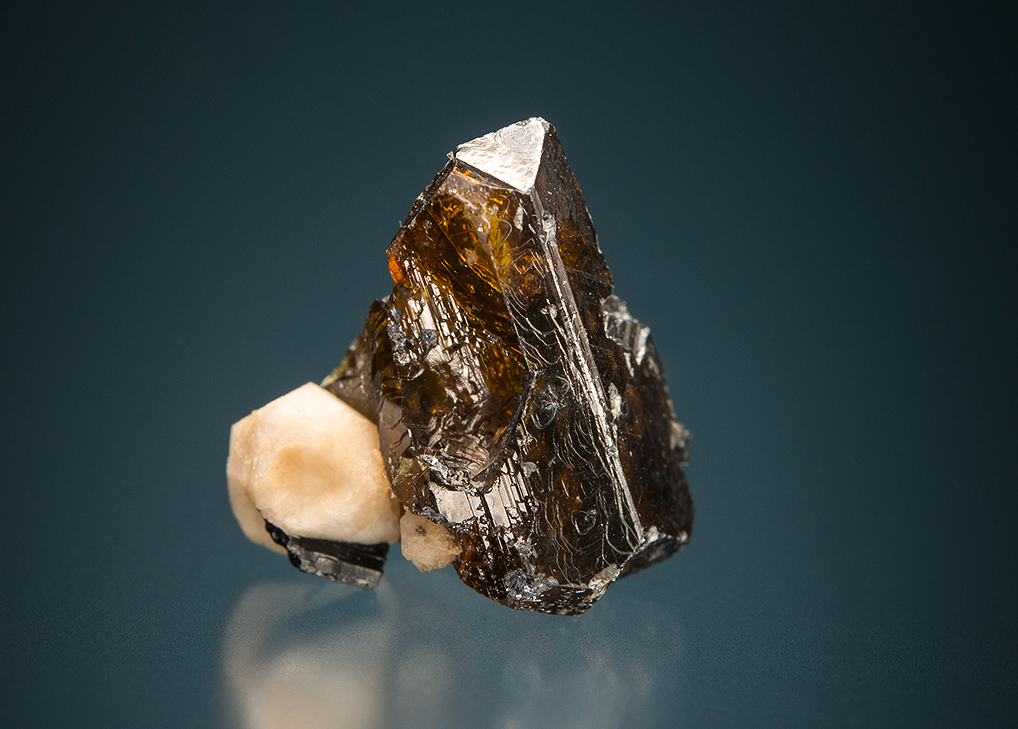 This is a truly fascinating association piece that could probably only come from Mont St. Hilaire. The translucent brown sphalerite twin has a nice little analcime crystal and laths of aegirine at the base.
