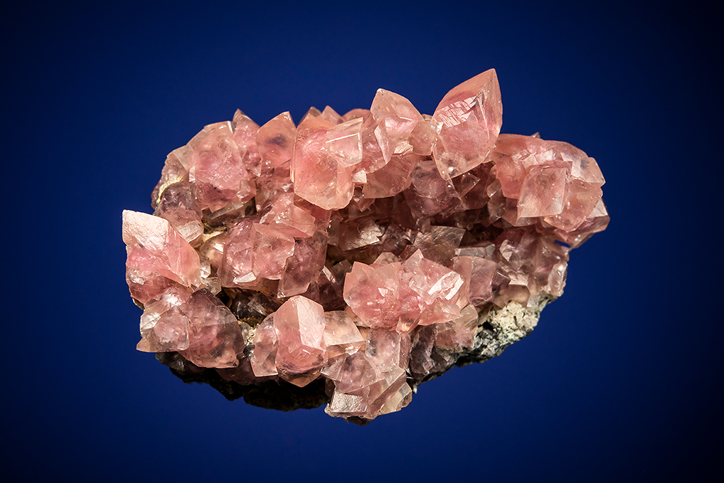 This is about as pretty as Tsumeb pink smithsonite gets. The crystals are sharp and several stand in relief from the smaller crystals below. The color is not the darkest pink, but is very appealing, and the luster is great for this style. Another fine miniature from the David Byers collection.