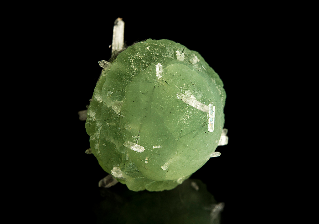 I don’t know who “WRS” is, but that is who Bill Smith got this specimen from in 1954. This is one of two “flying saucer” prehnites in the Smith collection. The single sphere of prehnite with a matte finish is encircled by a shiny ridge giving it that “flying saucer” appearance. This one is also studded with small colorless quartz needles. An eastern US classic.
