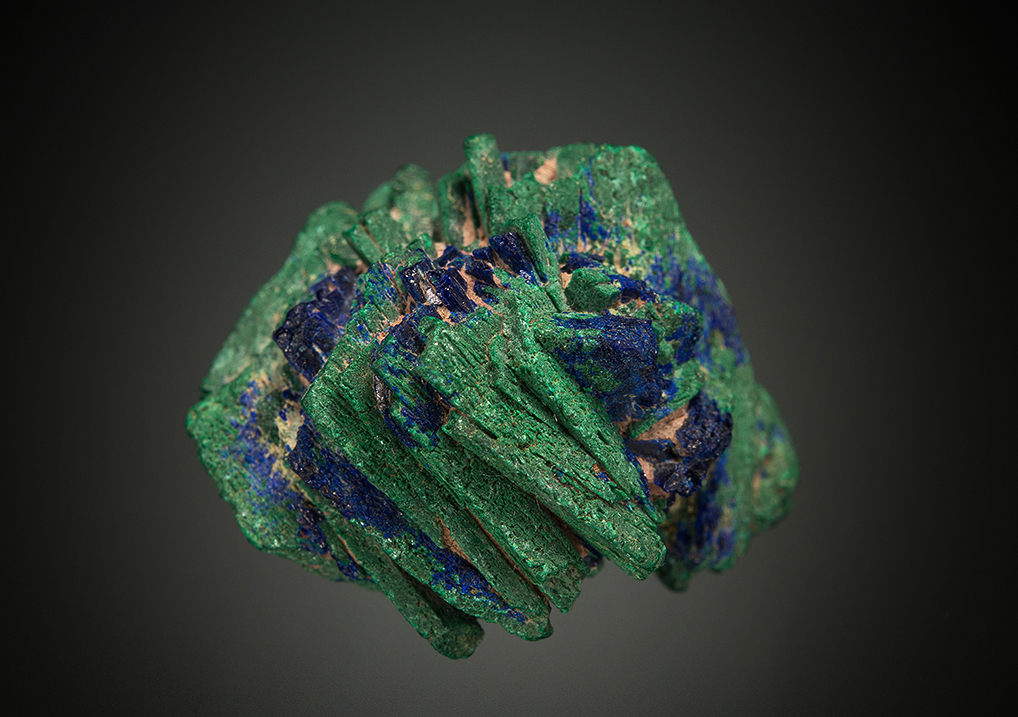 This malachite after azurite was acquired by Bryn Mawr College in 1890, decades before the current Morenci open-pit mining operation began. The pseudomorph is a nice rosette of crystals mostly replaced by malachite, but with a bit of remnant azurite.